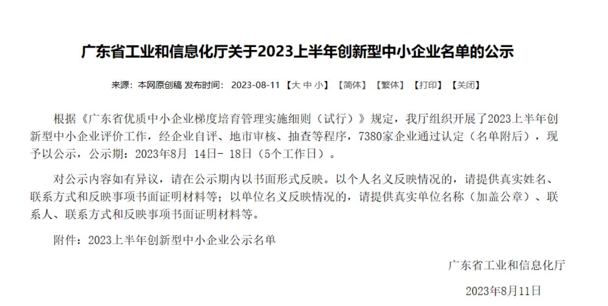根据工业和信息化部印发《优质中小企业梯度培育管理暂行办法》(以下简称《办法》),明确将培育创新型中小企业、专精特新中小企业、专精特新“小巨人”企业共3个层次优质中小企业梯队。其中创新型中小企业具有较高专业化水平、较强创新能力和发展潜力,是优质中小企业的基础力量。 我司顺利通过创新型中小企业认定,是对我司技术创新的肯定,我司将进一步推动创新发展,深化人才培养,沿着这样一个梯度去发展,脚踏实地,开拓创新,为我国经济社会发展作出贡献。